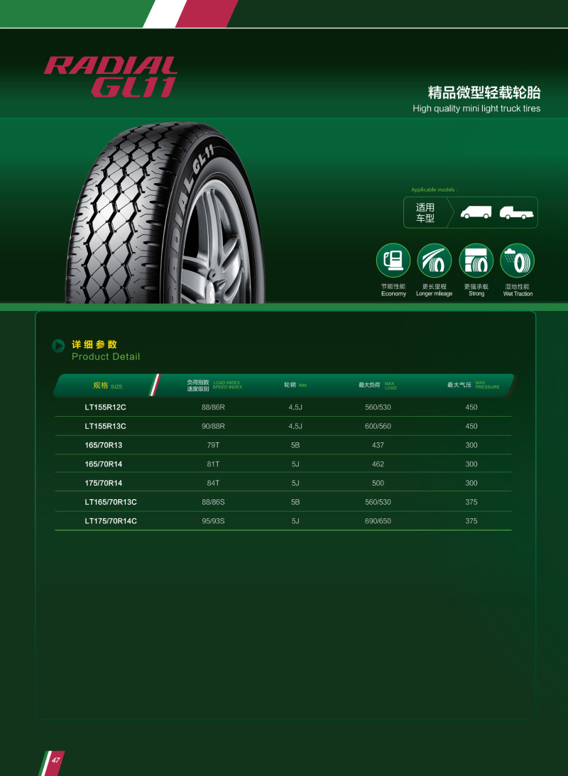 精品輕載輪胎,高強(qiáng)胎體結(jié)構(gòu),承載力更強(qiáng),耐磨橡膠配方和加深花紋,更高的使用壽命。