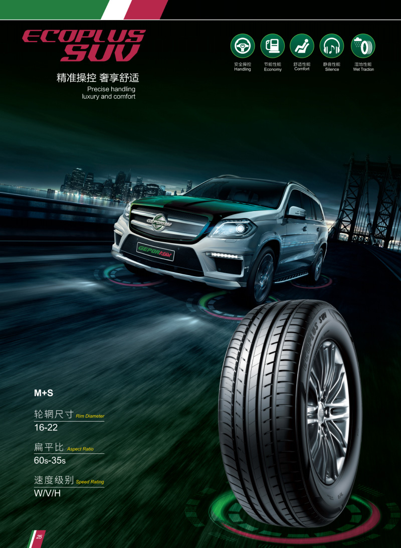 SUV專用輪胎,靜音胎面,超強抓地設計,精準操控。