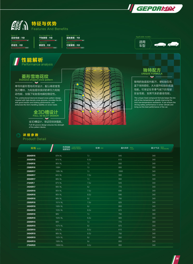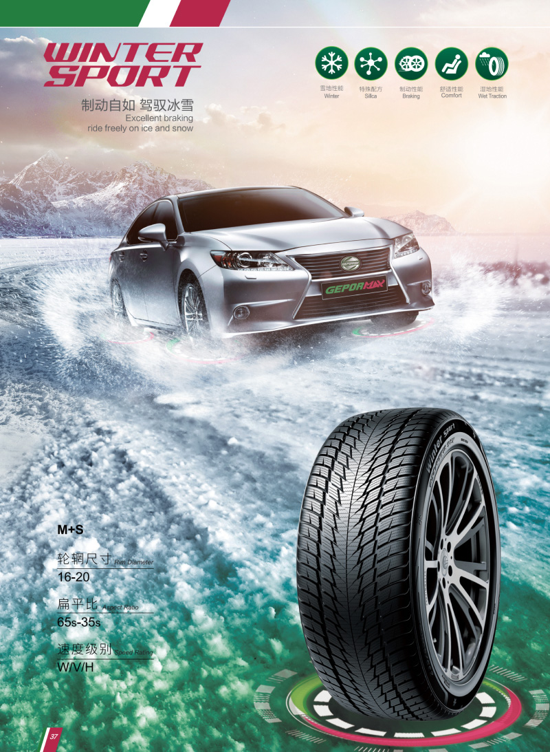 獨(dú)特胎面膠料配方及花紋,為輪胎提供良好的牽引力和制動(dòng)性能,可保證在冬季氣候下的駕駛安全性能。